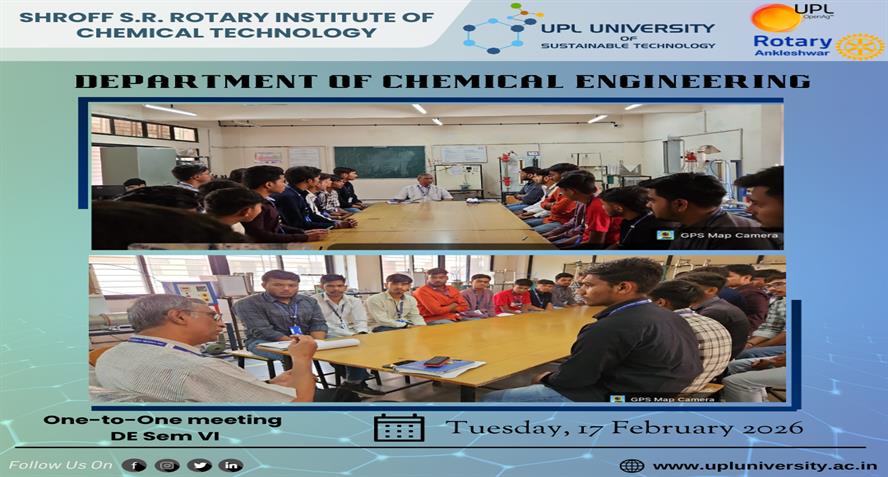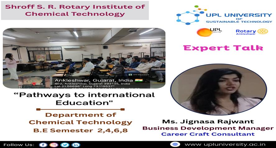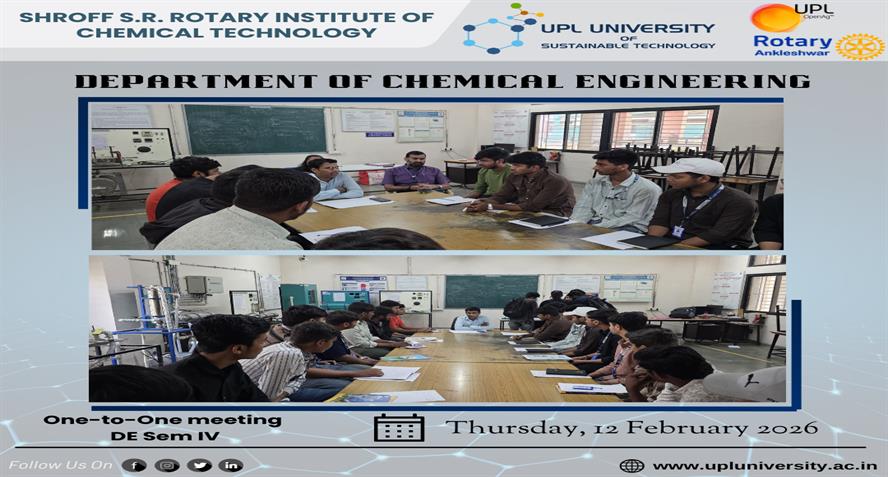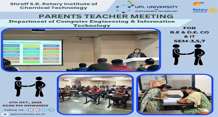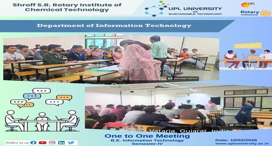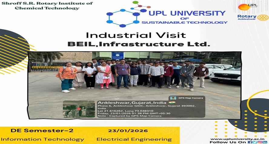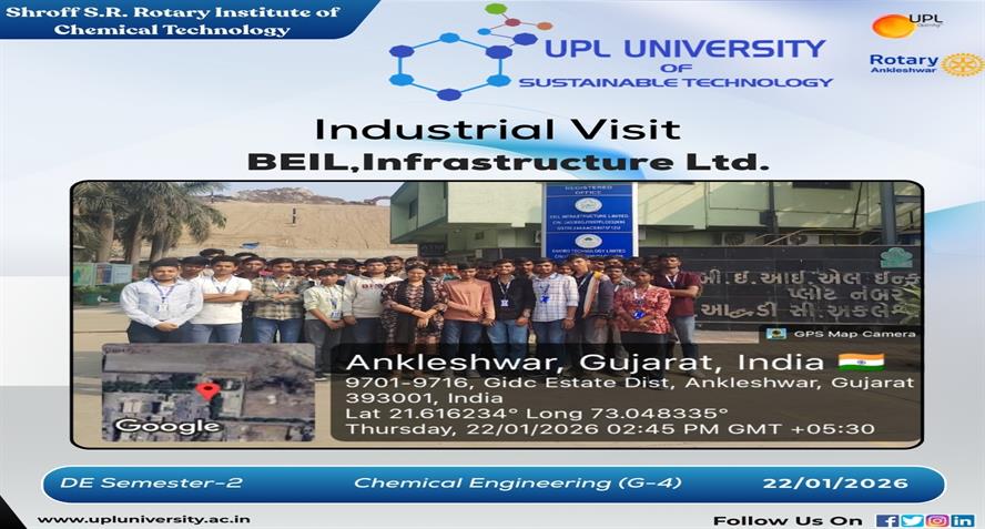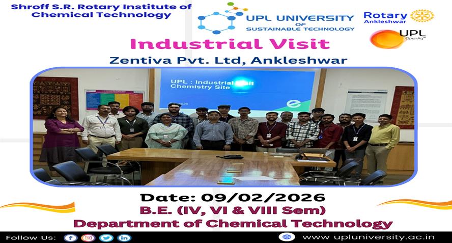 UPL University of Sustainable Technology has been established by Ankleshwar Rotary Education Society (ARES) to place Gujarat and India at one of the best education places of the World. The journey of UPL University of Sustainable Technology is started way back in 2011 with the establishment of Shroff S.R.Rotary Institute of Chemical Technology (SRICT) conducting UG (B.E.) courses in engineering in affiliation with GTU and approval of AICTE, New Delhi.