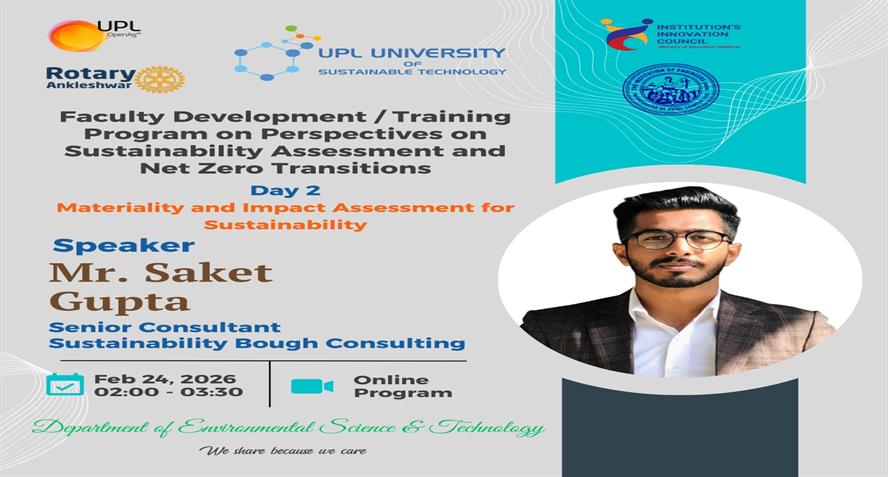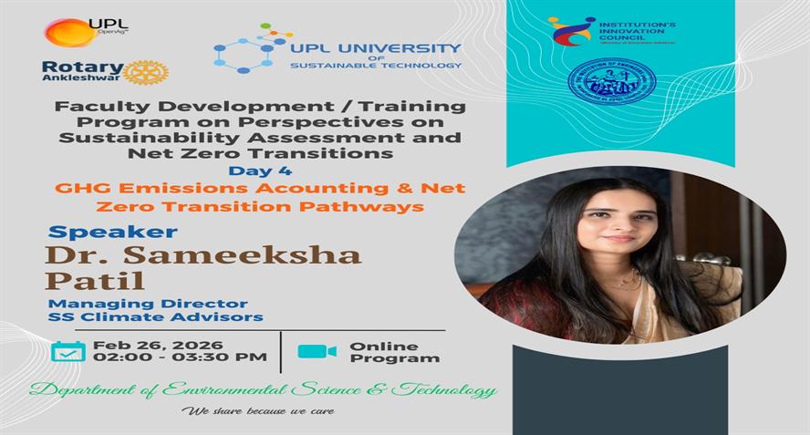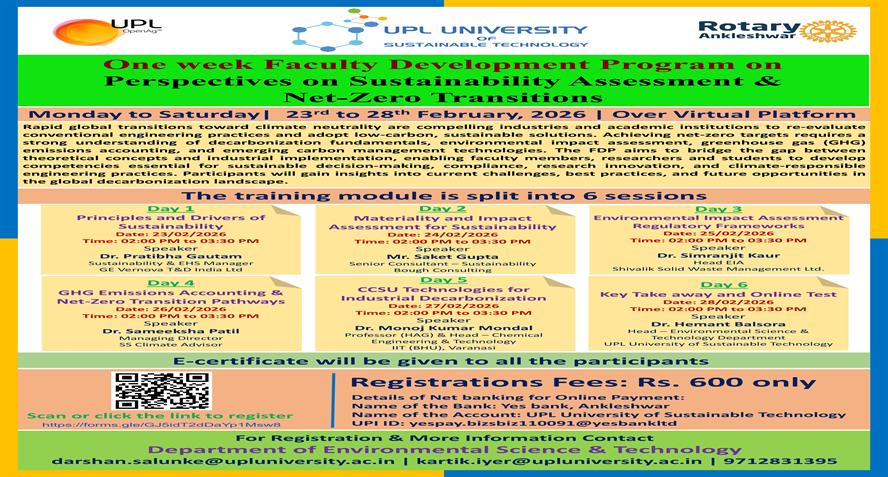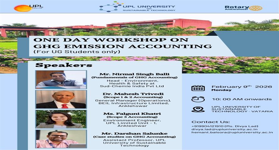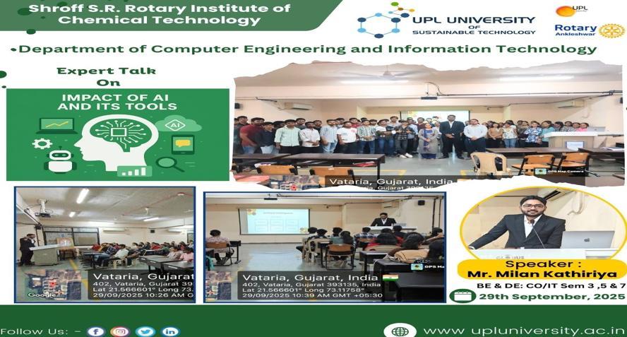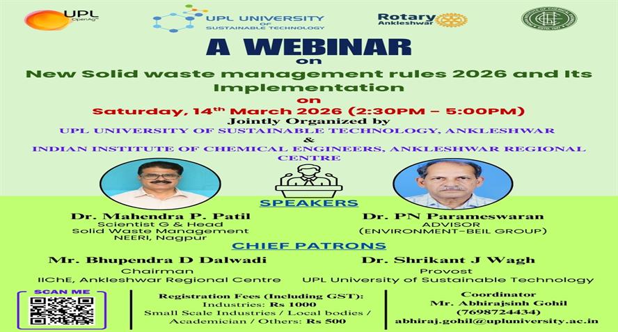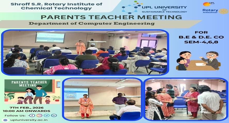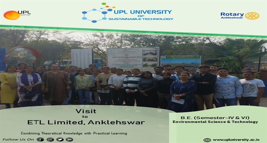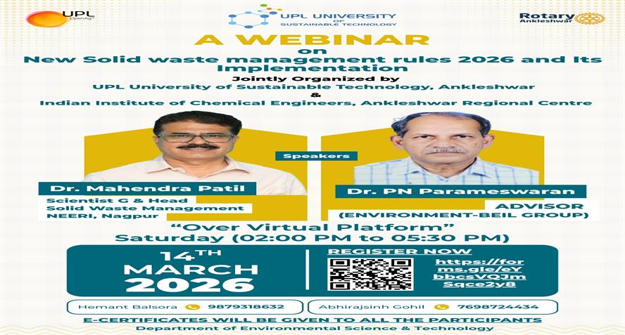 UPL University of Sustainable Technology has been established by Ankleshwar Rotary Education Society (ARES) to place Gujarat and India at one of the best education places of the World. The journey of UPL University of Sustainable Technology is started way back in 2011 with the establishment of Shroff S.R.Rotary Institute of Chemical Technology (SRICT) conducting UG (B.E.) courses in engineering in affiliation with GTU and approval of AICTE, New Delhi.
