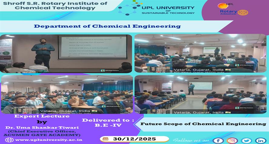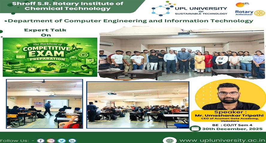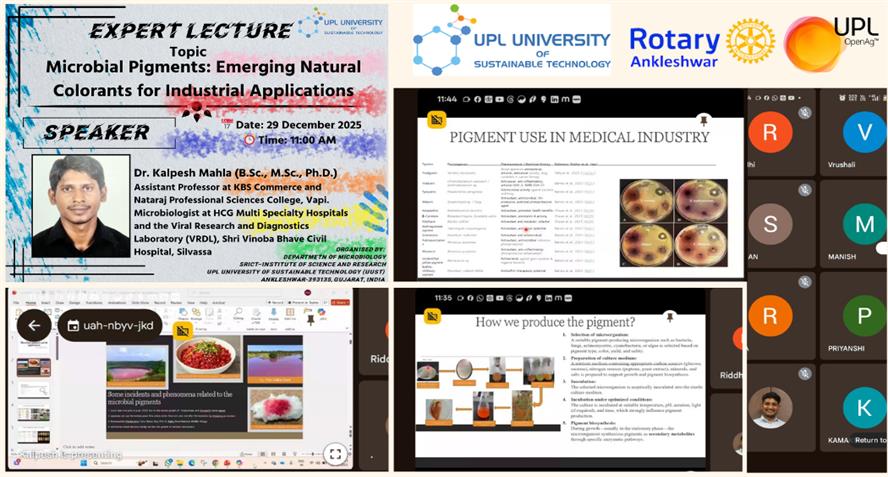 The Department of Microbiology, SRICT–Institute of Science & Research, UPL University of Sustainable Technology successfully organized an Expert Lecture on “Microbial Pigments: Emerging Natural Colora...