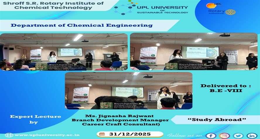 The Department of Chemical Engineering organized an Expert Lecture on 31st December 2025 for B.E. 8th Semester students on the topic “Study Abroad.” The session was delivered by Ms. Jignasha Rajwant,...