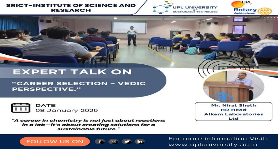 The Department of Chemistry, SRICT–ISR successfully organized an Expert Lecture for B.Sc. Semester VI and M.Sc. Semester IV students on the topic “Career Selection – Vedic Perspective.” The session wa...