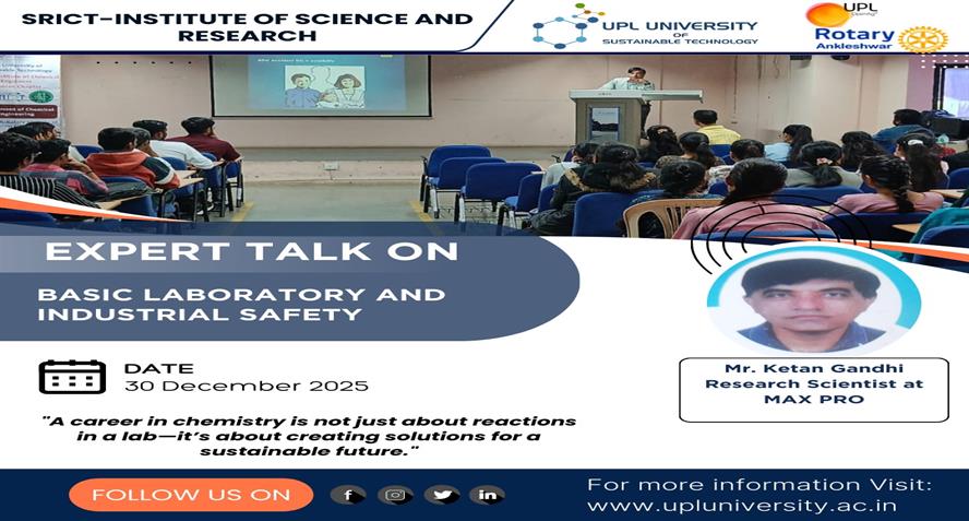 The Department of Chemistry, SRICT-ISR, successfully organized an Expert Lecture on Basic Laboratory and Industrial Safety on 30 December 2025 for B.Sc. Semester IV and VI and M.Sc. Semester IV studen...