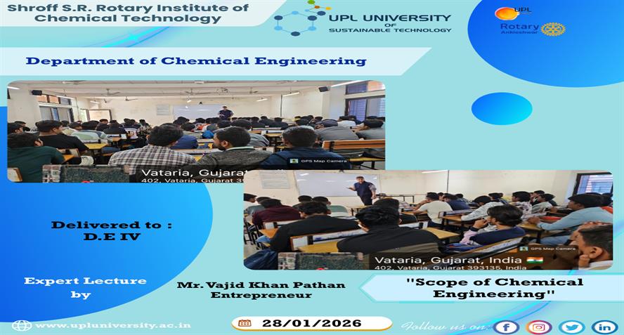 The Department of Chemical Engineering organized an insightful expert lecture for Diploma 4th Semester students on 28th January 2026. The session was delivered by Mr. Vajid Khan Pathan, who shared val...