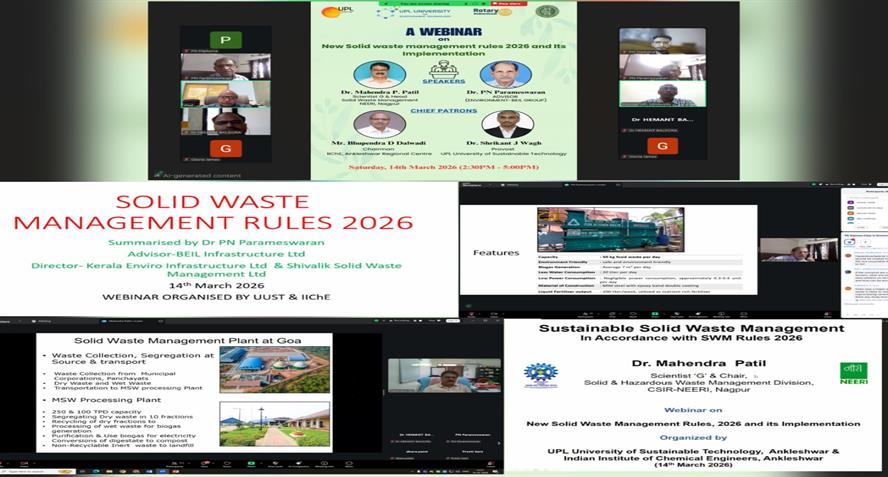 A webinar on “New Solid Waste Management (SWM) Rules 2026 & Its Implementation” was jointly organized by *UPL University* and the *IIChE Ankleshwar Regional Centre*.