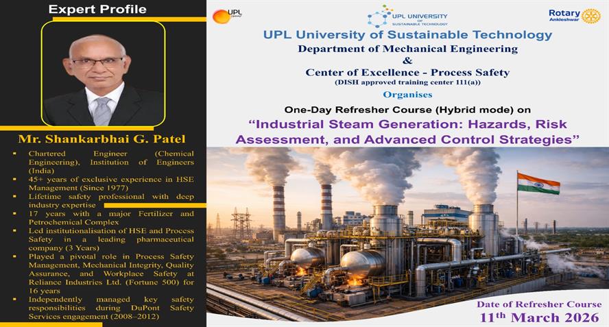 The Department of Mechanical Engineering at UPL University of Sustainable Technology successfully organized a high-impact, one-day training program on "Industrial Steam Generation: Hazards, Risk Assessment and Advanced Control Strategies" (ISG:HRA&ACS) on March 11, 2026. Conducted in hybrid mode, the program bridged the gap between academic expertise and industrial application, attracting 17 professional participants from various industries (14 offline and 3 online). The day was packed with five intensive technical sessions led by eminent speakers, covering: ποΈ The Boiler: Fundamental concepts. π§ Operation & Maintenance: Solving core industrial problems. π‘οΈ Safety & Case Studies: Critical considerations for coal-fired boilers. β οΈ Hazards & Control: Advanced strategies for steam generation. π Statutory Compliance: Navigating legal and safety regulations. A special thank you to our sponsor, NV Conveyor Belt Jointer, for their support in making this knowledge-sharing initiative a grand success. We remain committed to fostering excellence and safety in industrial practices!