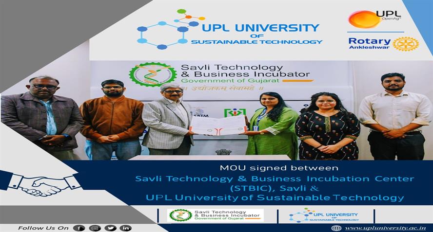 UPL University of Sustainable Technology proudly signed a Memorandum of Understanding (MoU) with the Savli Technology & Business Incubation Center (STBIC), Savli on 03 January 2026.